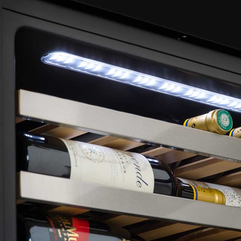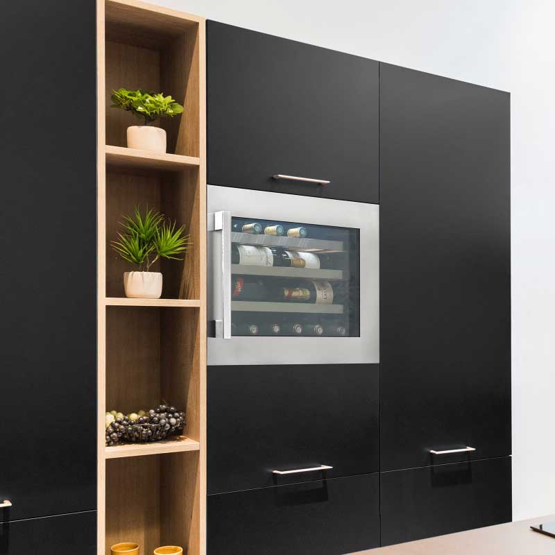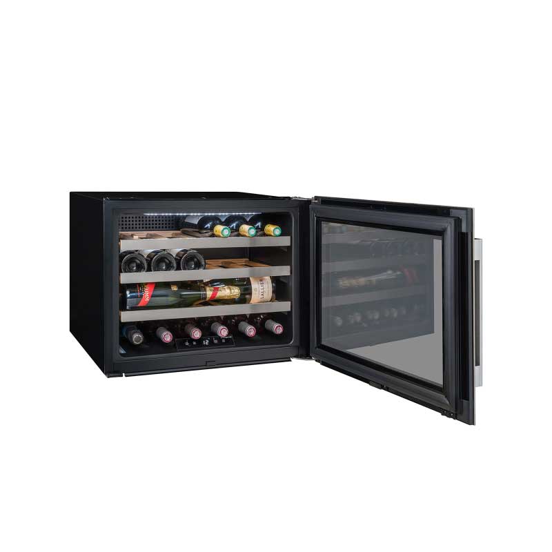 Podrum AVI24S2X ima reverzibilna staklena vrata za prilagodbu vašim ograničenjima integracije u kuhinjski namještaj. Otvaranje desno ili lijevo, izbor je vaš. Uz 3 klizne drvene police i 1 fiksnu prezentacijsku policu, vaše boce su lako dostupne i prezentirane na estetski način svakome tko naiđe na vaš vinski podrum.