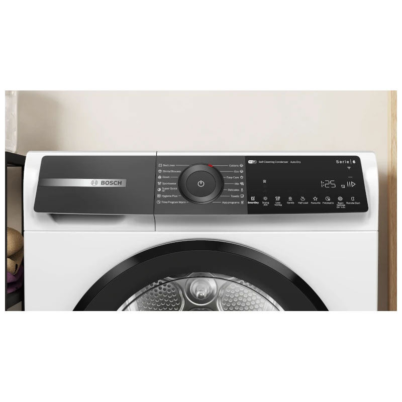 Sušilica rublja s toplinskom pumpom, Serie 6, kapacitet 9 kg. Sušilica s toplinskom pumpom koja osigurava stalnu nisku potrošnju energije s automatskim čišćenjem kondenzatora i brine se za vašu odjeću zahvaljujući funkcijama Auto Dry i Smart Dry. Samočisteći kondenzator: održava kondenzator bez vlakana i niti kako bi se osigurala optimalna energetska učinkovitost. Auto Dry: automatski suši rublje do točne željene razine suhoće. Smart Dry: povezana sušilica i perilica rublja preporučuju pravi program sušenja. Smart Start: optimizirajte potrošnju energije uz automatski odabir vremena početka. Home Connect: kućanski uređaji sad se mogu pametno povezivati kako bi svakodnevni život učinili jednostavnijim.
