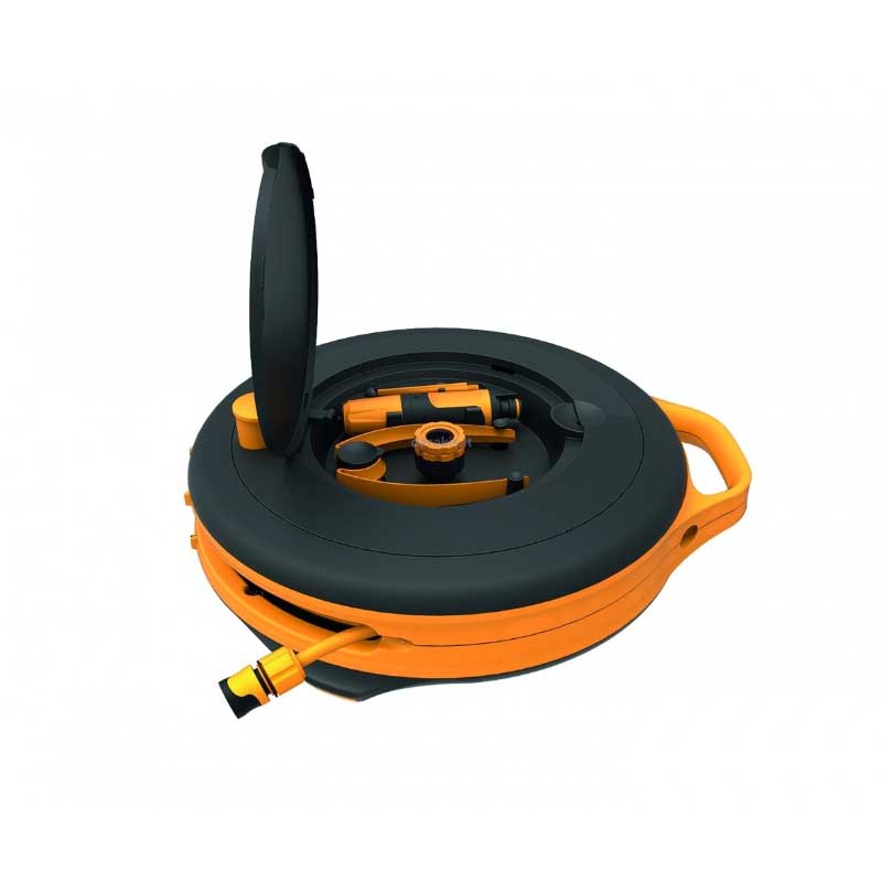 Set sa prihvatom 3/8″(9mm) i crijevom duljine 15m i kompletom pribora. Postavljanje i vertikalnom i u horizontalnom položaju i vrtnji od 360° za veću dostupnost u Vašem vrtu. UV zaštita. Mogućnost montaže na zid uz narudžbu zidnog nosača. Drška i kotači za jednostavan transport.