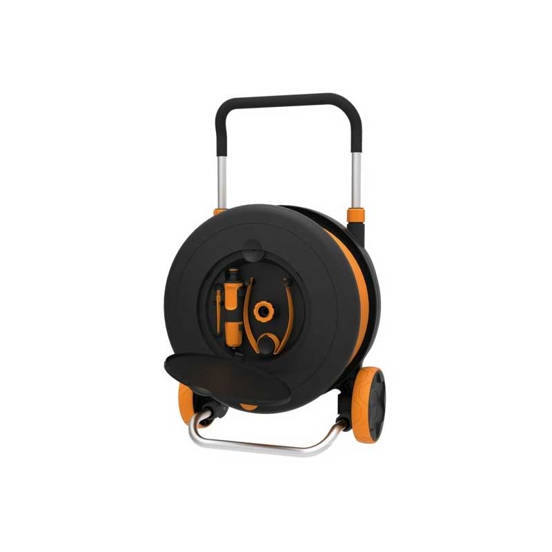 Set sa prihvatom 1/2″(13mm) i crijevom duljine 21,5m i kompletom pribora. Postavljanje i vertikalnom i u horizontalnom položaju i vrtnji od 360° za veču dostupnost u Vašem vrtu. UV zaštita. Mogućnost montaže na zid uz narudžbu zidnog nosača. Drška i kotači za jednostavan transport.
