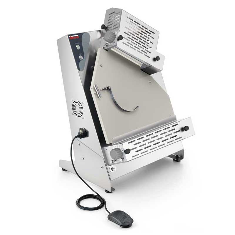 Savršen za razvlačenje pizze. Razvlačenje se radi na hladno tako da se ne mijenja sastav i konzistencija tijesta. Debljina i promjer tijesta se lako namjeste prema potrebama korisnika. Okvir inox AISI 304. Klizač lako skidljiv za lakše održavanje. Strugala na vrhu i donji valjci lako rastavljivi radi čišćenja. Kontrole inox, IP 67. Zaštite ruku na valjcima standardno.
