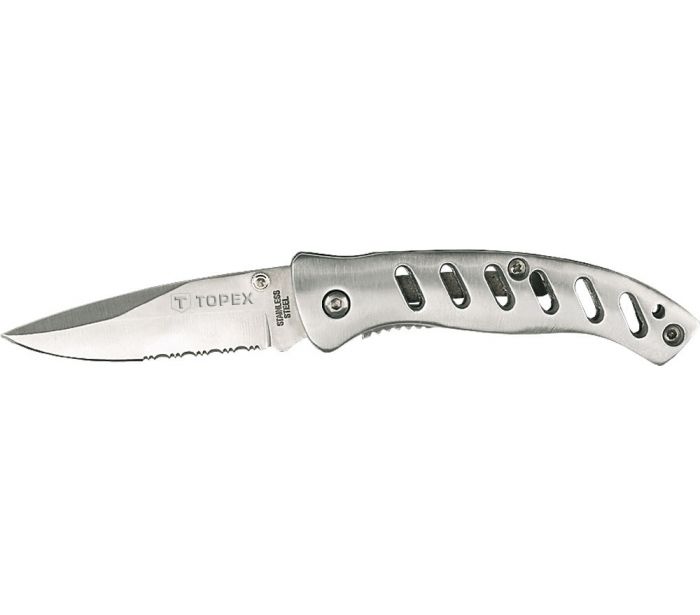 TOPEX džepni nož s oštricom dugom 80 mm. Oštrica je izrađena od visokokvalitetnog nehrđajućeg čelika za dugi vijek trajanja alata. Čvrsto metalno tijelo omogućuje rad s velikim opterećenjima. Zaključavanje noža osigurava sigurnost pri uporabi. Ergonomski oblik ručke poboljšava udobnost rada. Kuka za remen je dodatna prednost, ona omogućuje da uvijek nosite nož pri ruci. Mogućnost preklapanja olakšava skladištenje i transport. Brend TOPEX orijentiran je na DIY entuzijaste.