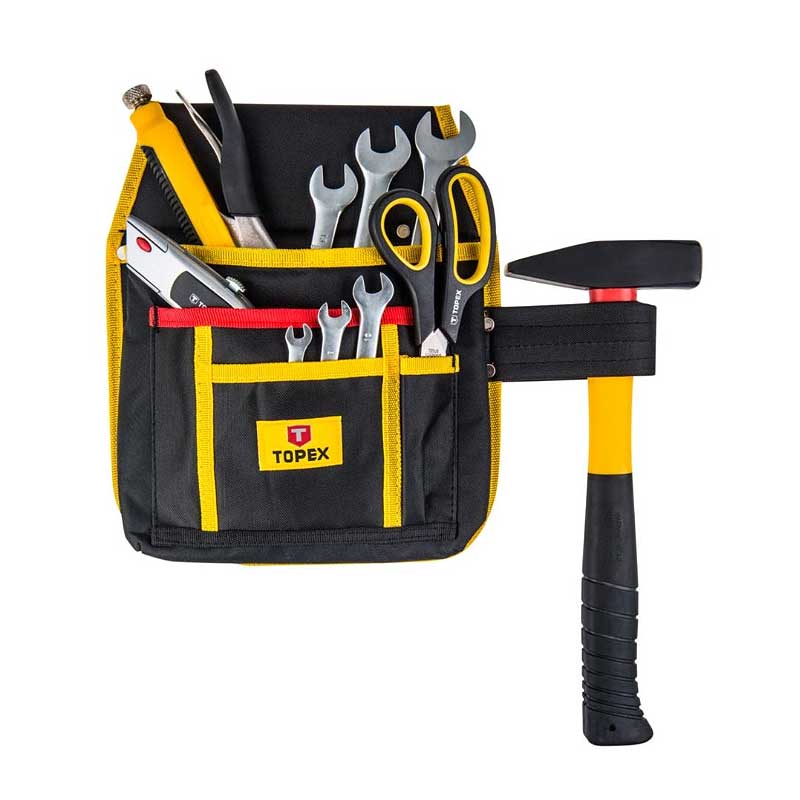 TOPEX pojasni džep od čvrste plastike. Ima 4 pretinca za alat i držač na koji se može zakačiti čekić. Pričvršćen je za pojas hlača. Brand TOPEX orijentiran je na entuzijaste u kućnim popravcima.