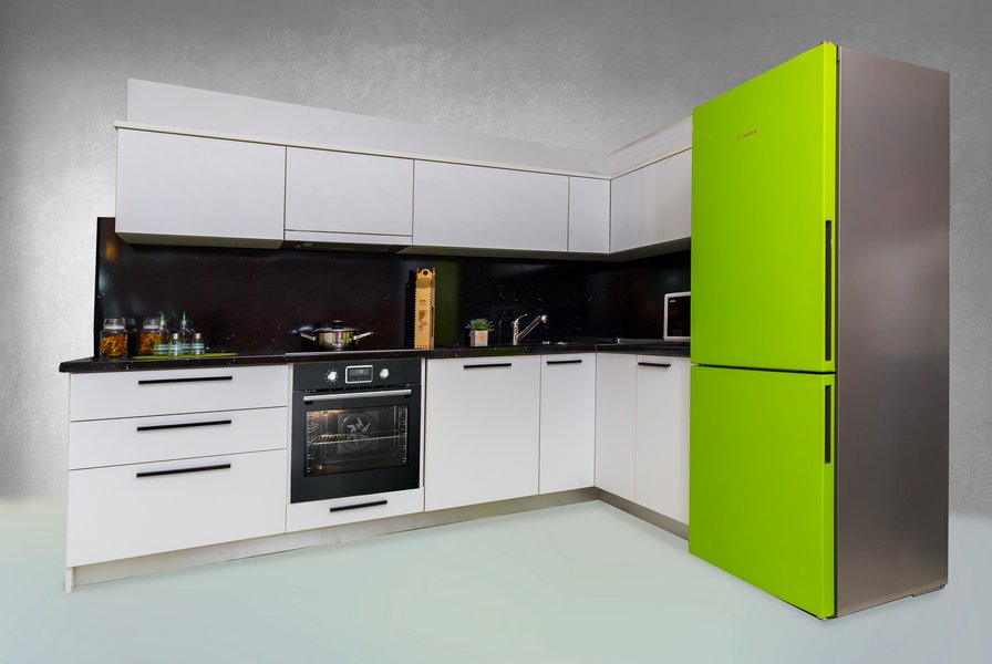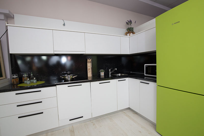 Kuhinja “Lady” izrađena od visokokvalitetnog iverala u boji bijela mat sa kombinacijom radne ploče i zidne obloge u crnoj boji visokoga sjaja.