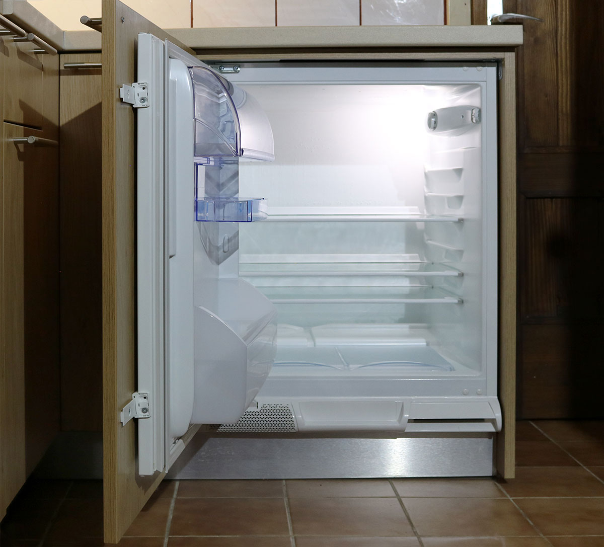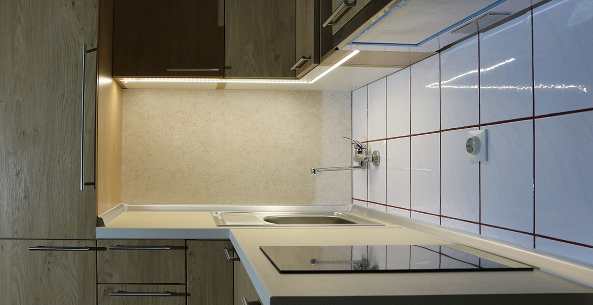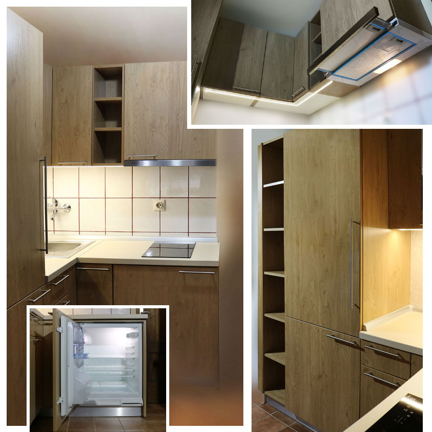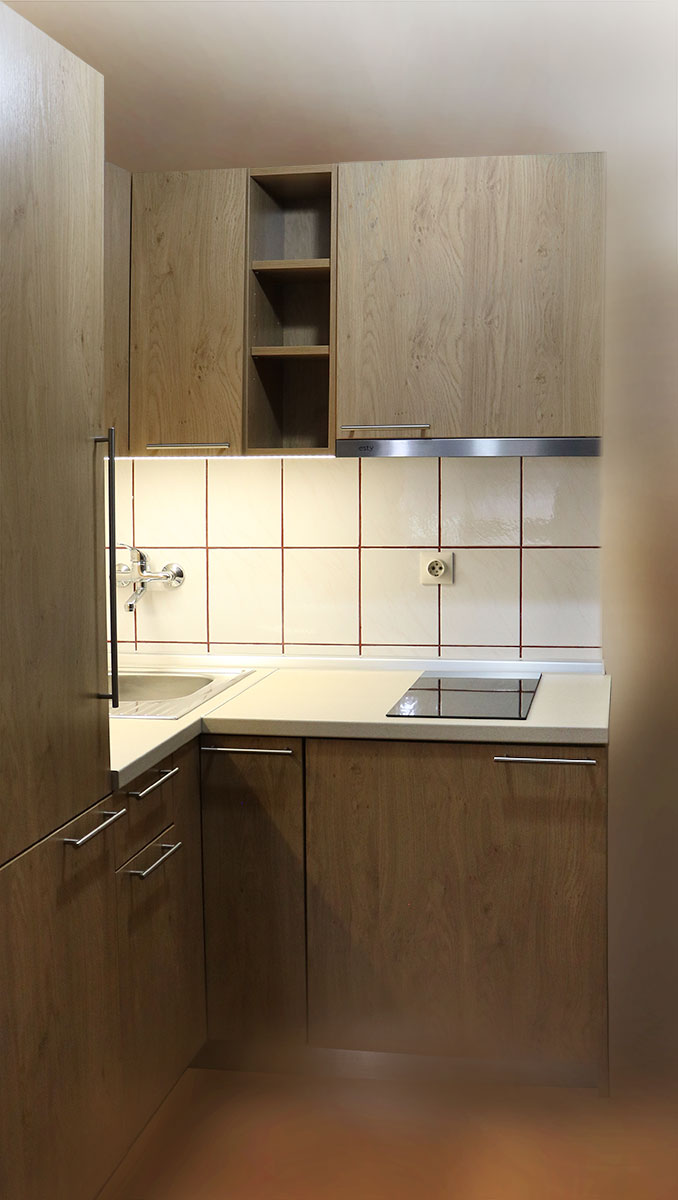 Podpultni ugradbeni hladnjak maloga obujma idealan je za uklapanje u ovu malu kuhinju.