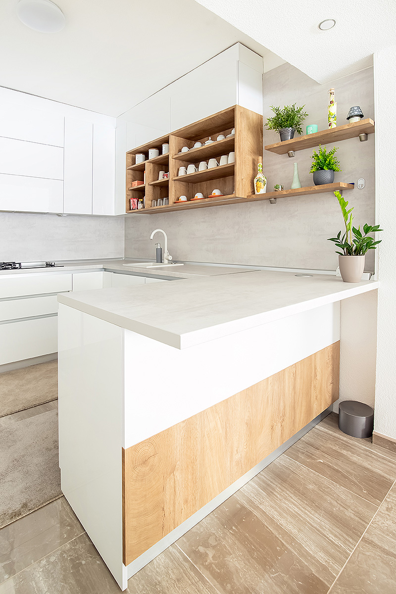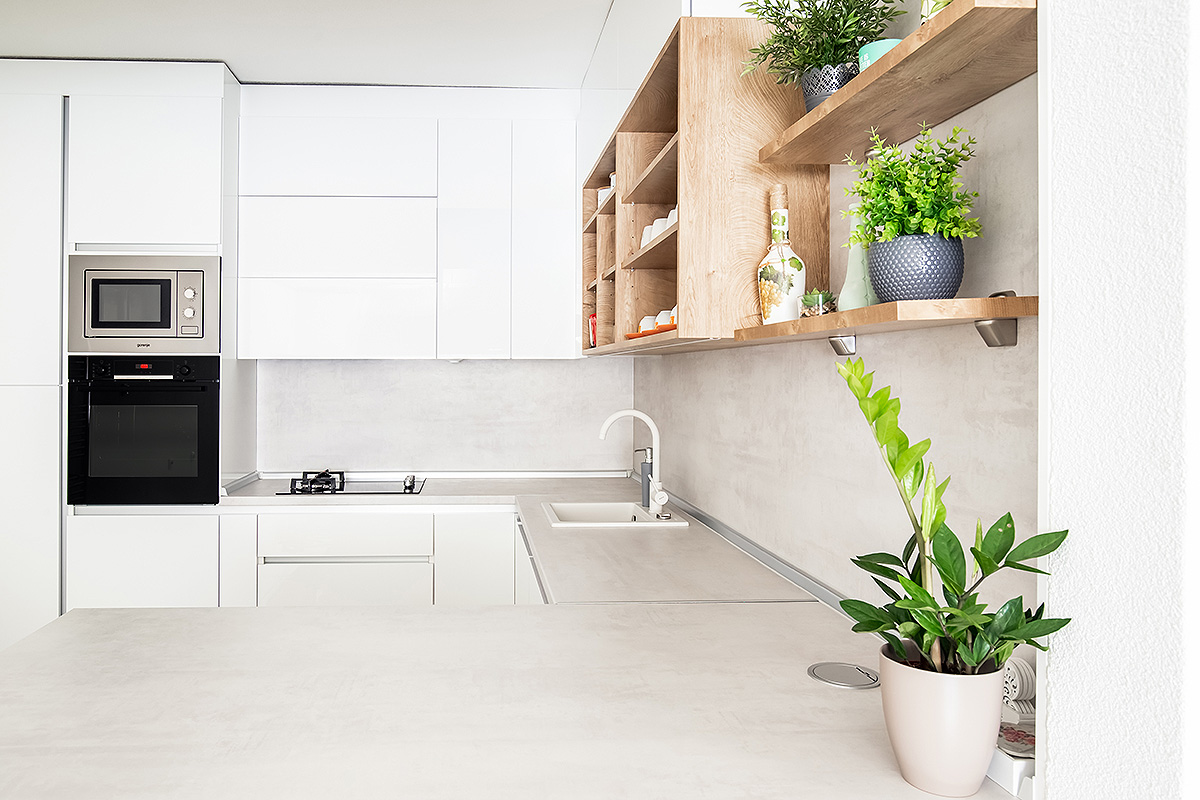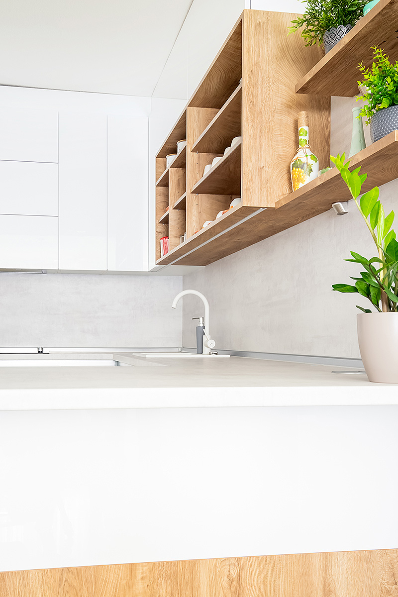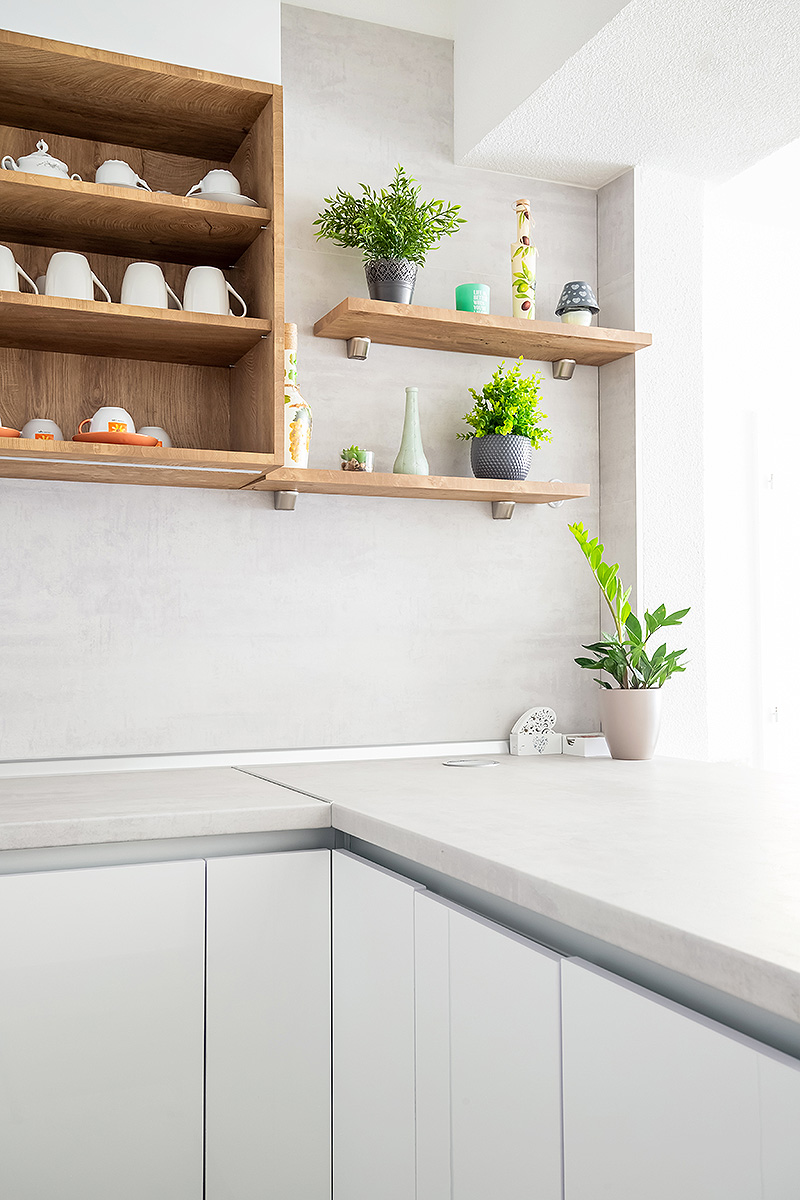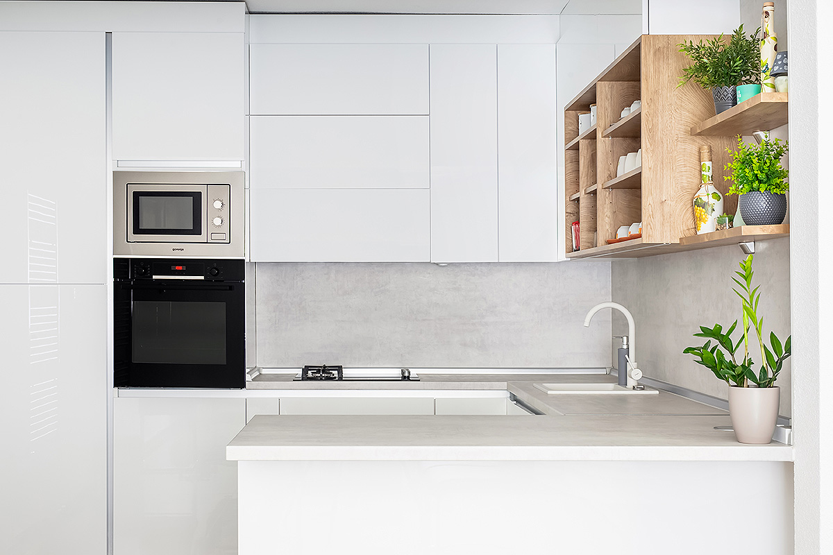Možda je tradicionalna bijela boja kuhinje upravo ono što želite. Pri takvom odabiru treba pripaziti na veličinu prostora, obzirom da je bijela kuhinja (koje spadaju pod “skandinavski dizajn”!) prvenstveno namijenjena za velike, otvorene prostore. U ovoj manjoj kuhinji sterilnosti bijele boje suprotstavlja se prirodni dekor popularnoga hrasta čiji je predstavnik otvorena polica, pa i donja polovica otoka. No ako ni to nije dovoljno, malo zelenila uvijek može popraviti dojam!