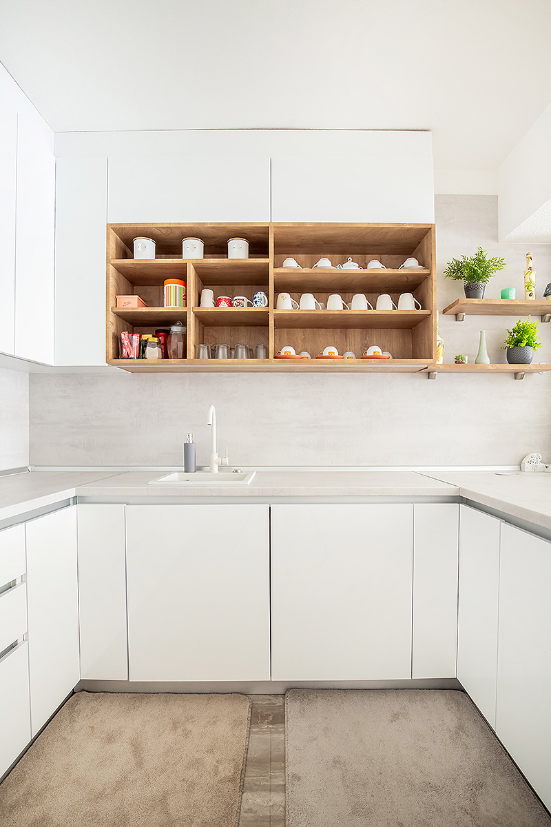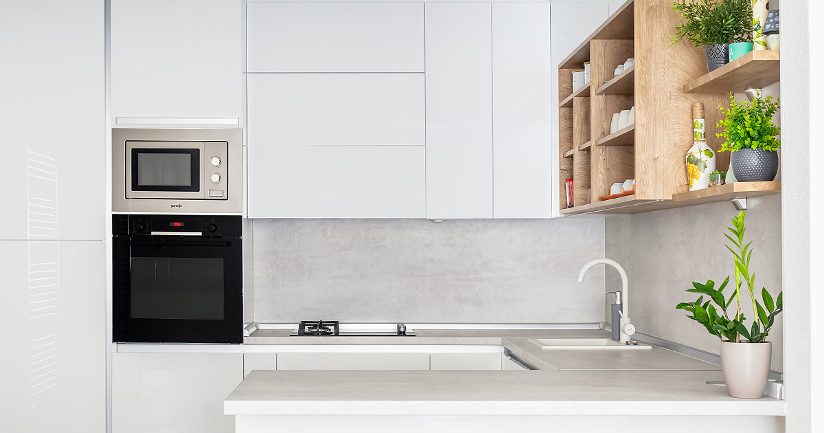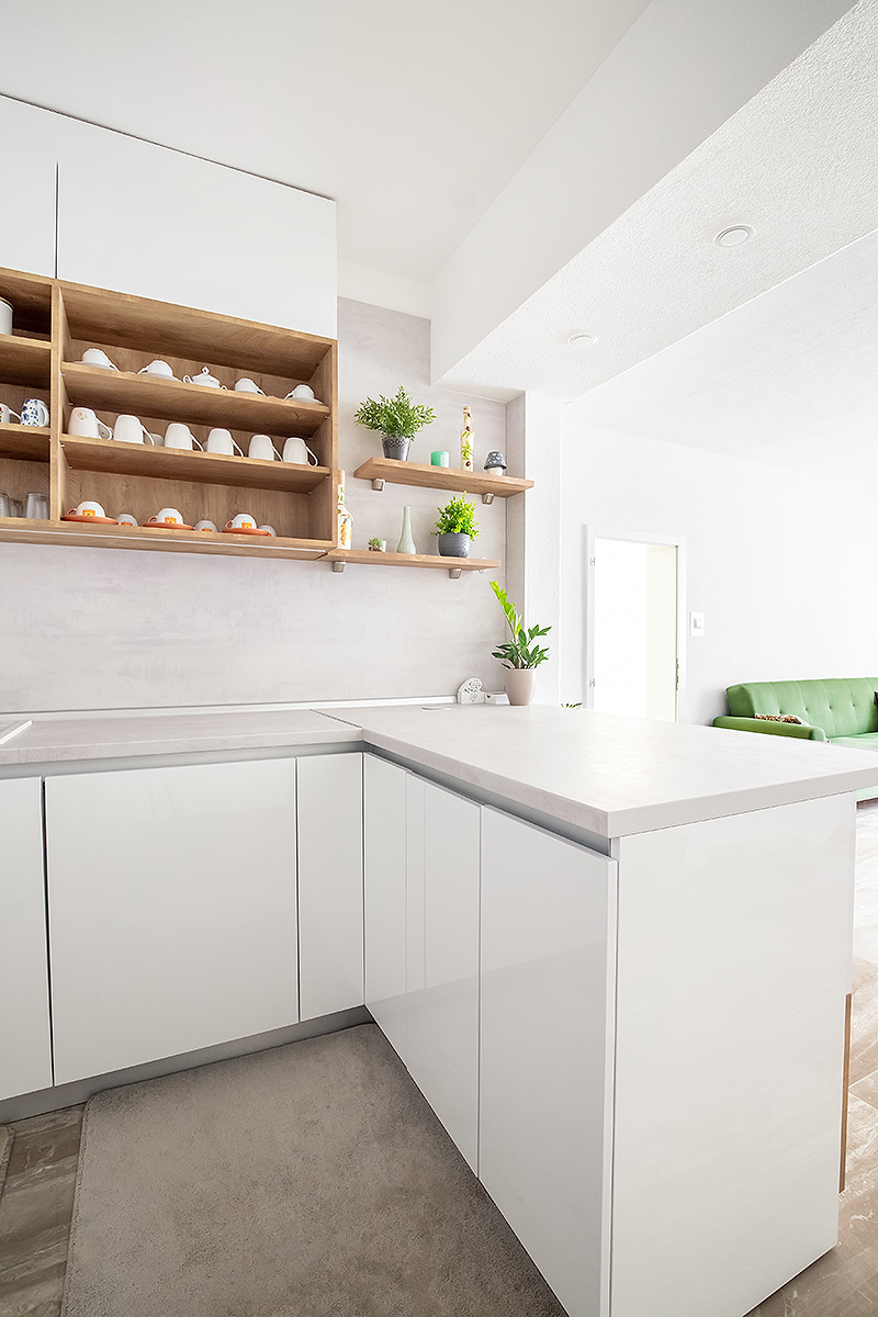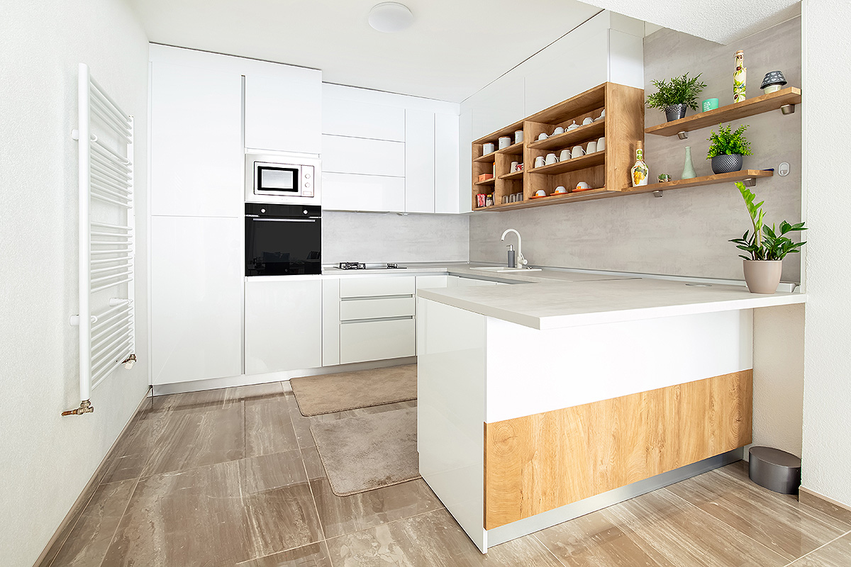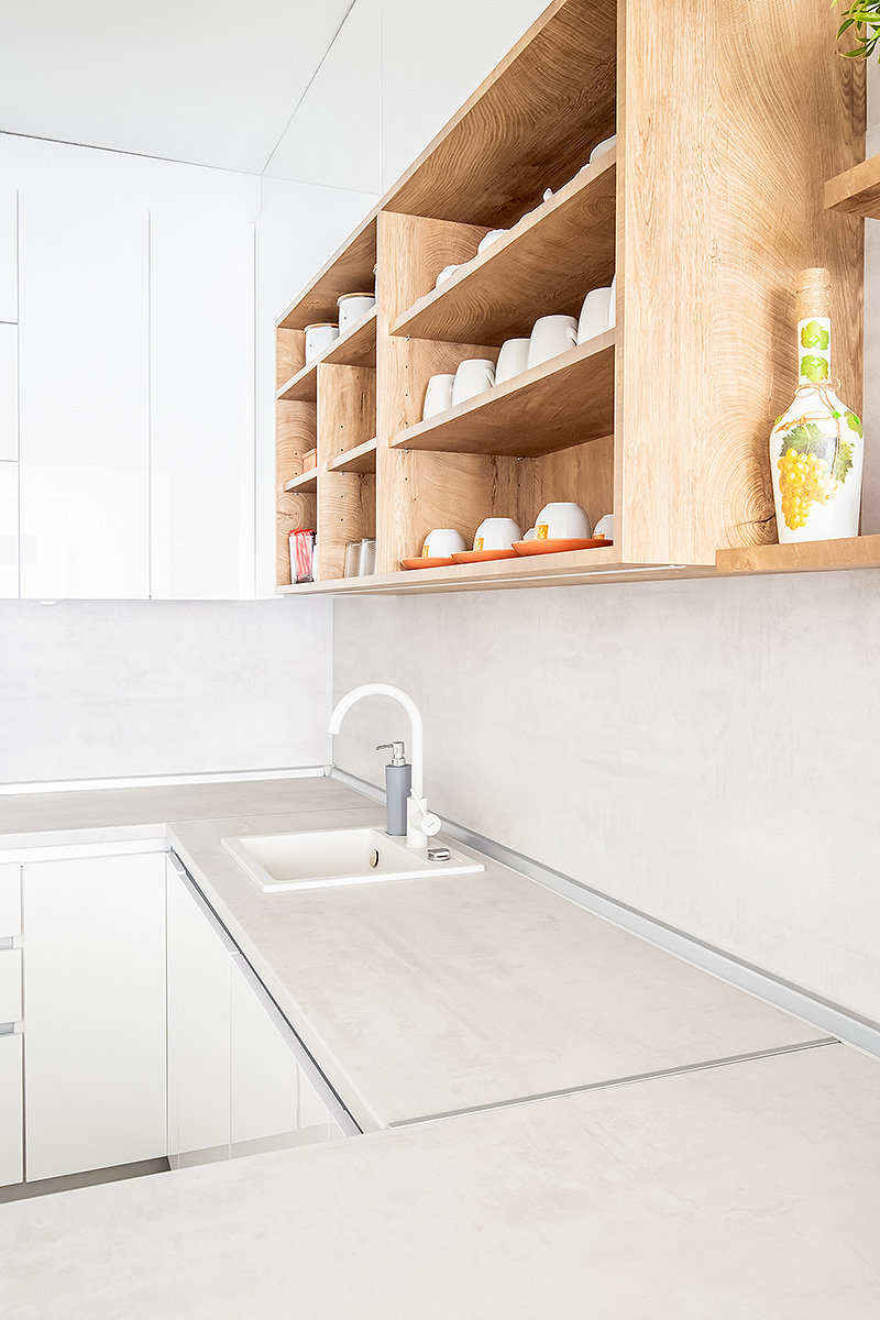 Možda je tradicionalna bijela boja kuhinje upravo ono što želite. Pri takvom odabiru treba pripaziti na veličinu prostora, obzirom da je bijela kuhinja (koje spadaju pod “skandinavski dizajn”!) prvenstveno namijenjena za velike, otvorene prostore. U ovoj manjoj kuhinji sterilnosti bijele boje suprotstavlja se prirodni dekor popularnoga hrasta čiji je predstavnik otvorena polica, pa i donja polovica otoka. No ako ni to nije dovoljno, malo zelenila uvijek može popraviti dojam!