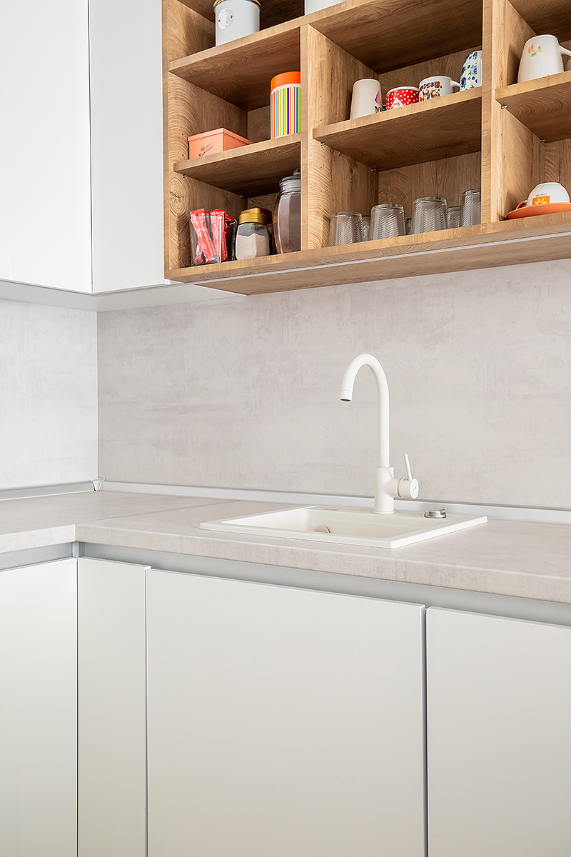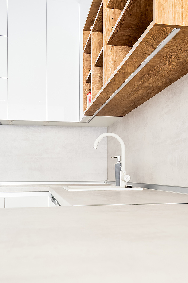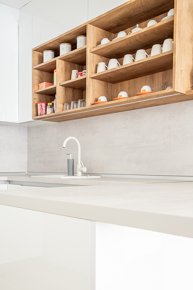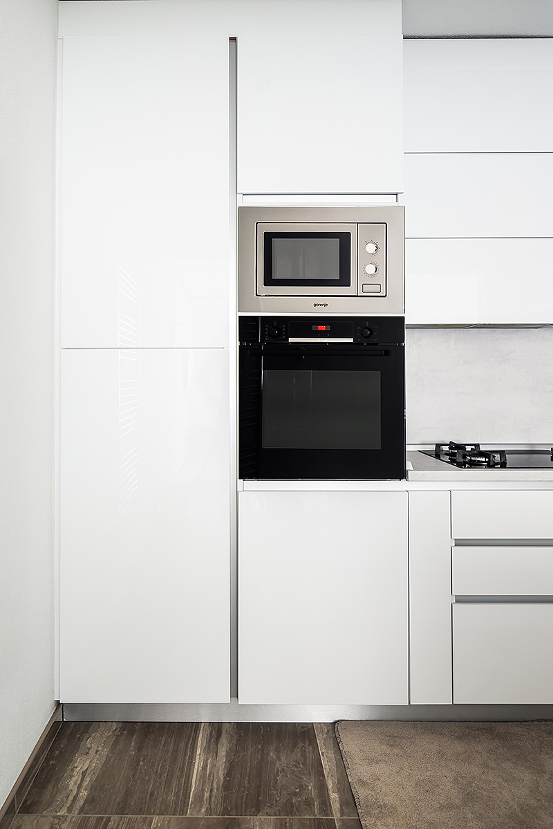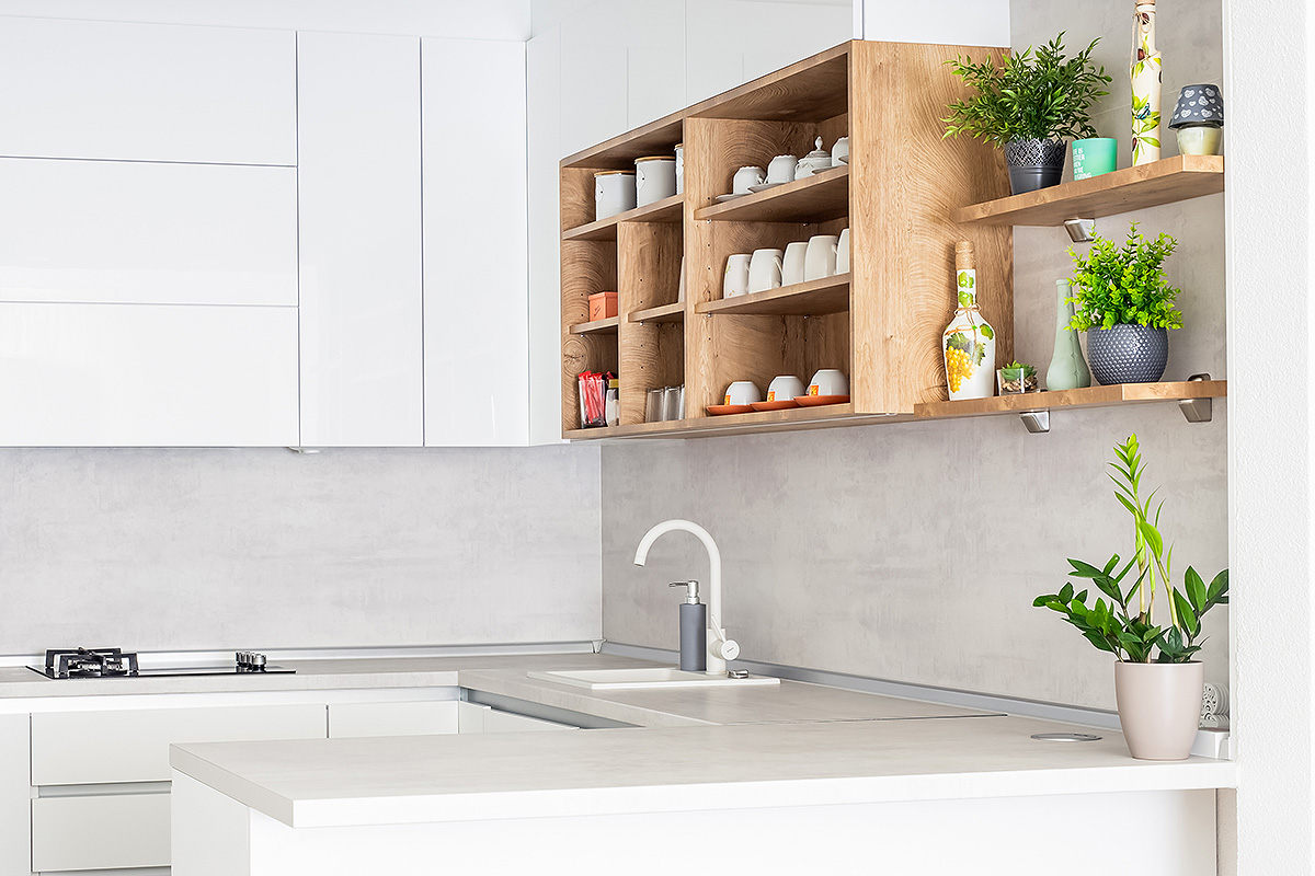 Možda je tradicionalna bijela boja kuhinje upravo ono što želite. Pri takvom odabiru treba pripaziti na veličinu prostora, obzirom da je bijela kuhinja (koje spadaju pod “skandinavski dizajn”!) prvenstveno namijenjena za velike, otvorene prostore. U ovoj manjoj kuhinji sterilnosti bijele boje suprotstavlja se prirodni dekor popularnoga hrasta čiji je predstavnik otvorena polica, pa i donja polovica otoka. No ako ni to nije dovoljno, malo zelenila uvijek može popraviti dojam!