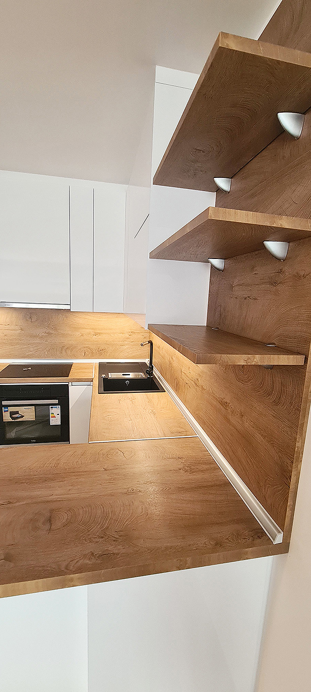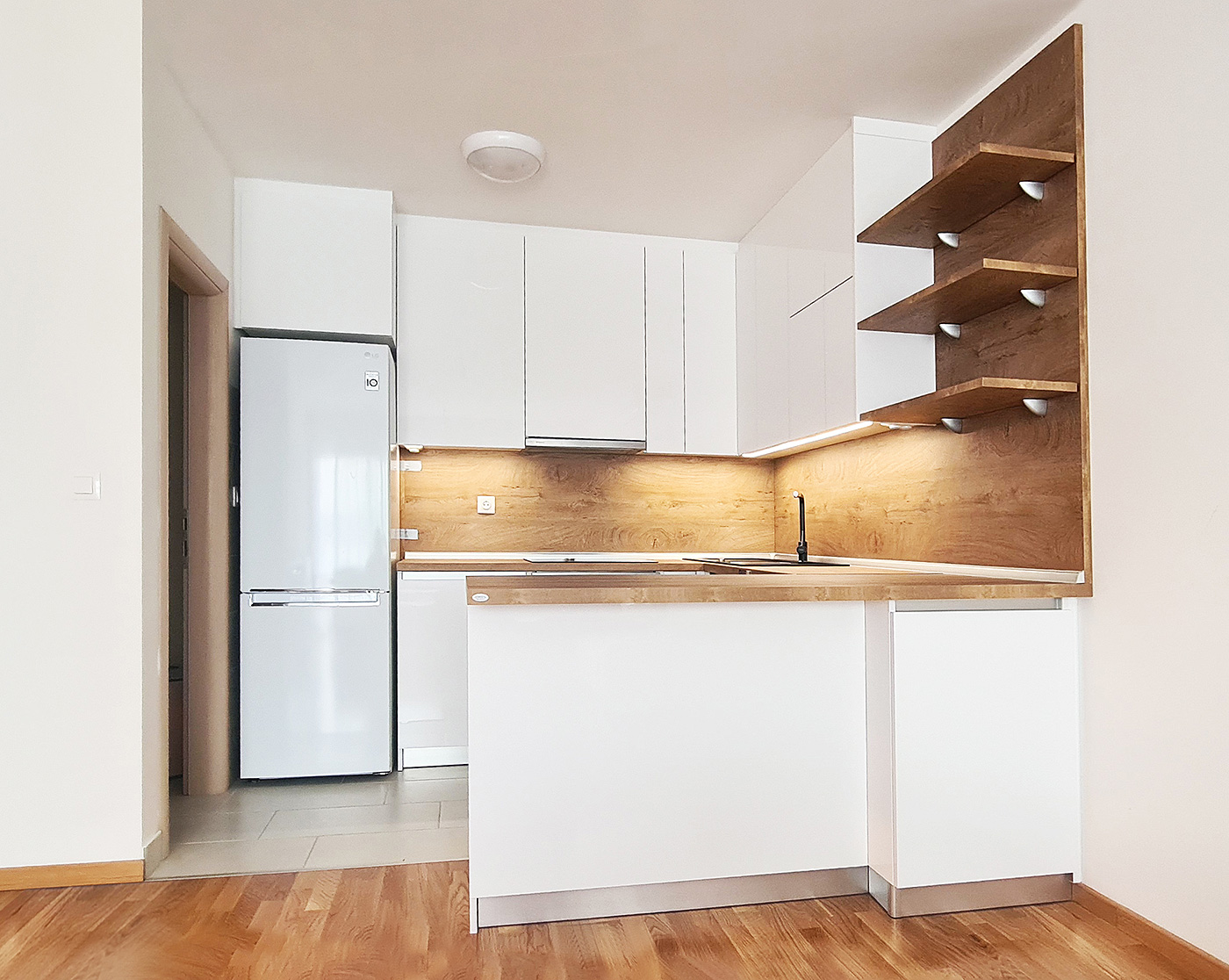 Okov: Panti s usporivačima, ladice su matrix runner (drveni korpus ladice, metalna vodilica s usporivačem). Podizni okov Aventos, jedna izvlačna košara.