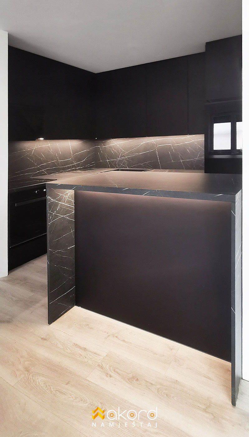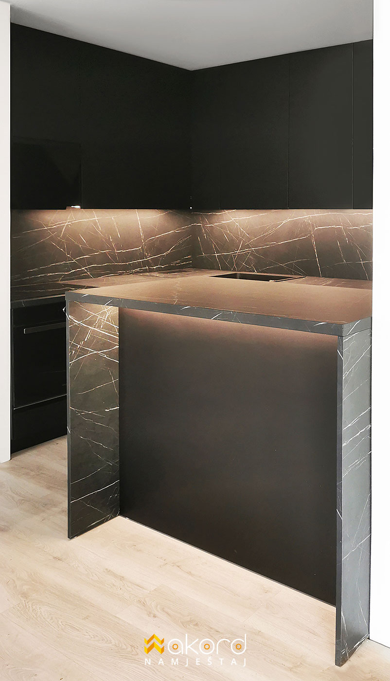 Kuhinja: Dekor: iverala u dekoru 2190OM optimat i F206 (bokovi na otoku), radna ploča i zidna obloga F206ST, na donjim elementima otvaranje preko Gola profila crne boje