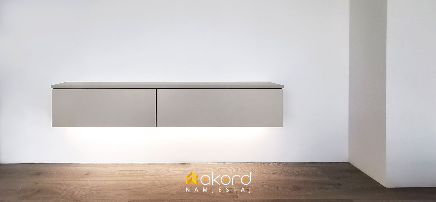 Komoda: TV komoda izrađena od iverala u dekoru šampanjac, otvaranje ladica na push open, LED rasvjeta ispod komode.