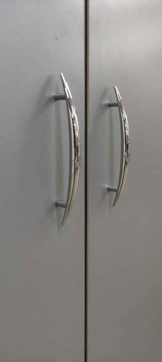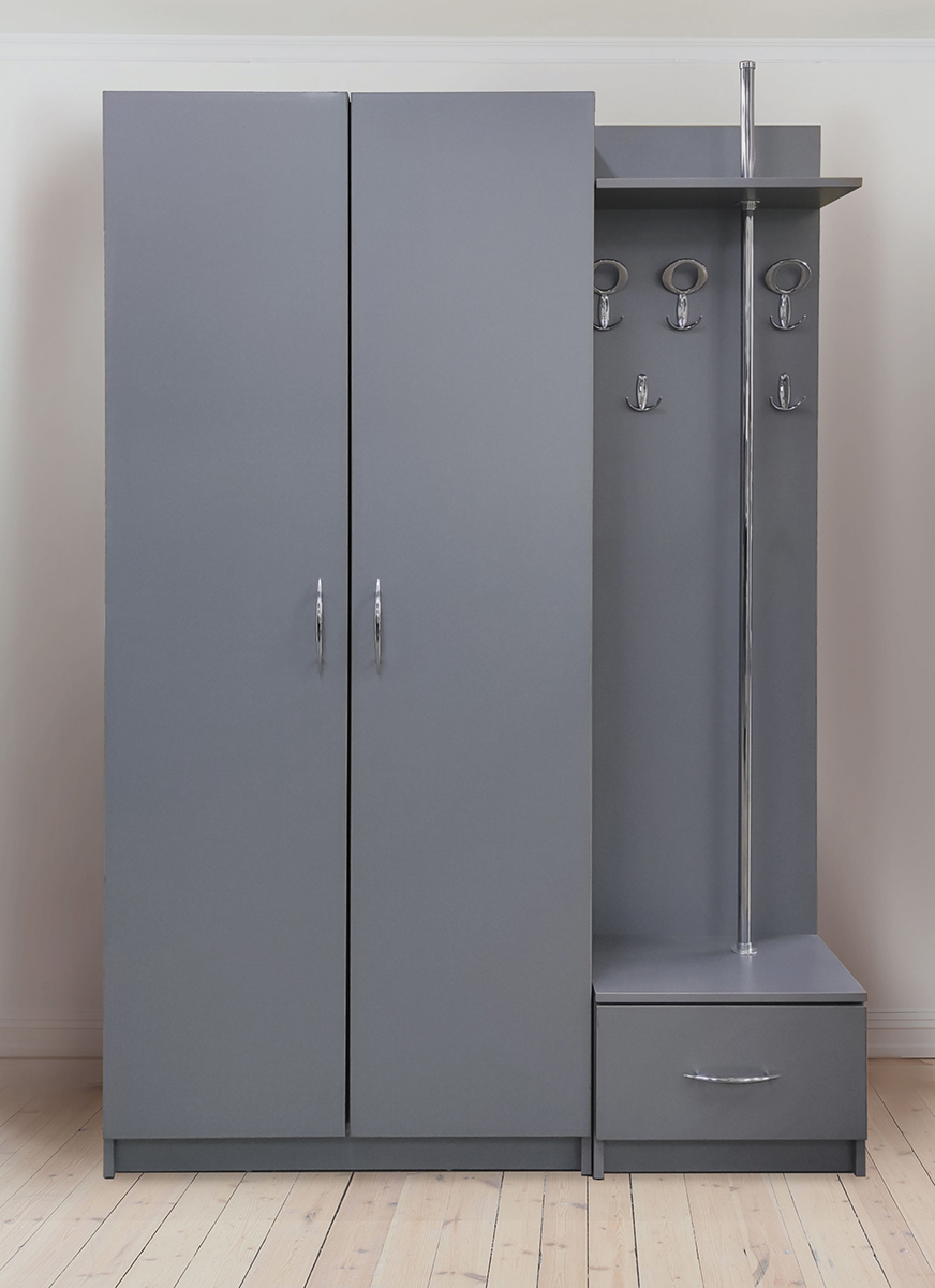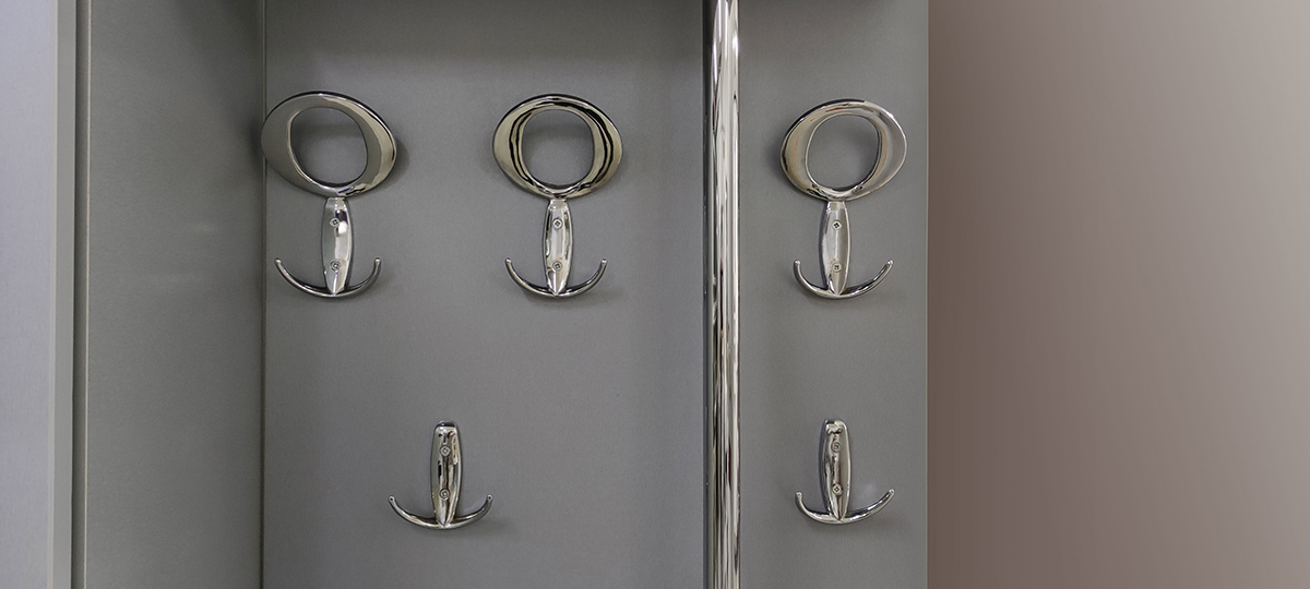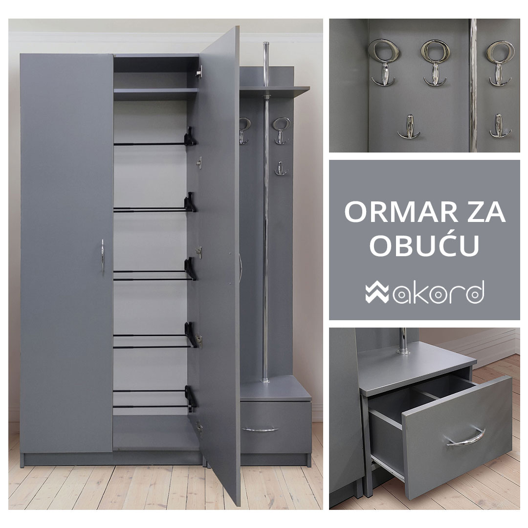 Sivi iveral; kromirane kukice za odjeću; metalne ručke; plastični držači za obuću.