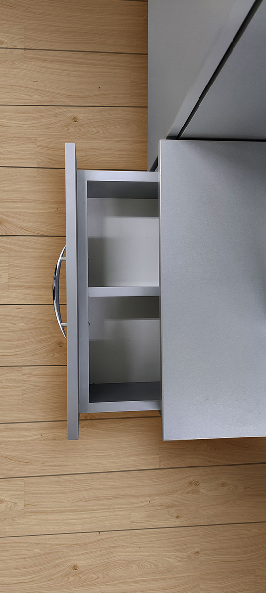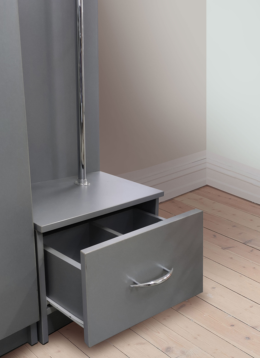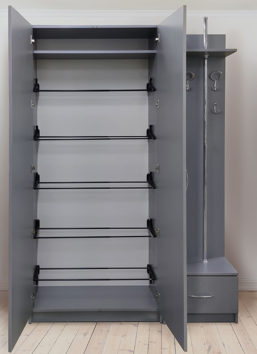 Ladica za pohranjivanje je podijeljena u dva odlomka, gdje možete pohranjivati četke i kreme za cipele, žlice za cipele i sve potrebne predmete za održavanje obuće. Na ploči spojenoj sa ladicom nalazi se 5 kromiranih kukica za vješanje odjeće.