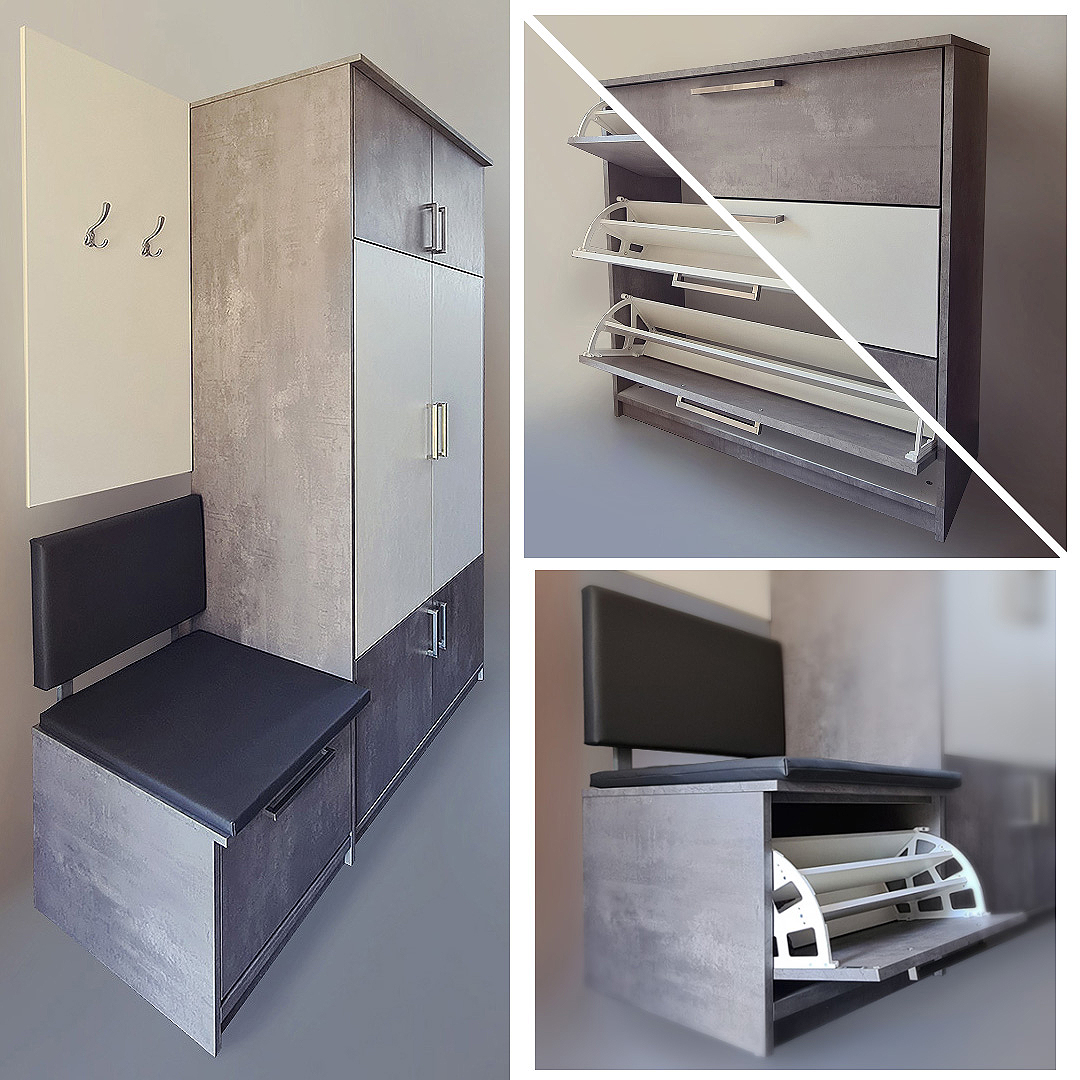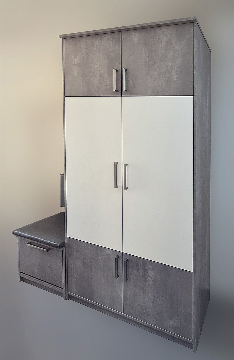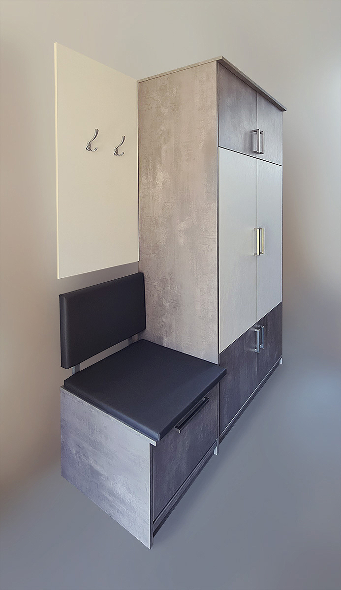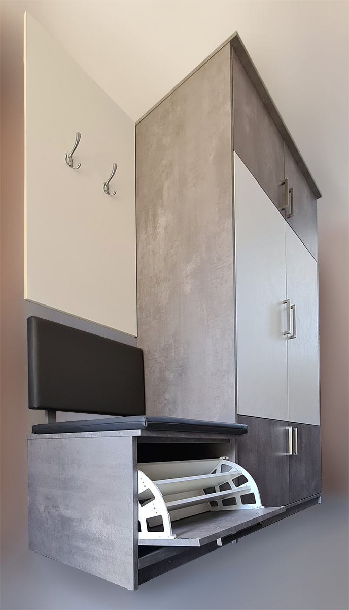 Ormar s profilima biserno sivog i bijelog dipejtanog iverala debljine 19 mm upotpunjuje i sjedalica od memory-pjene presvučena eko-kožom, kao i prostor ispod iste za dodatno odlaganje obuće. Profil na kojem se nalaze aluminijske vješalice također su izrađene od dipejtano bijelog iverala debljine 19 mm.
