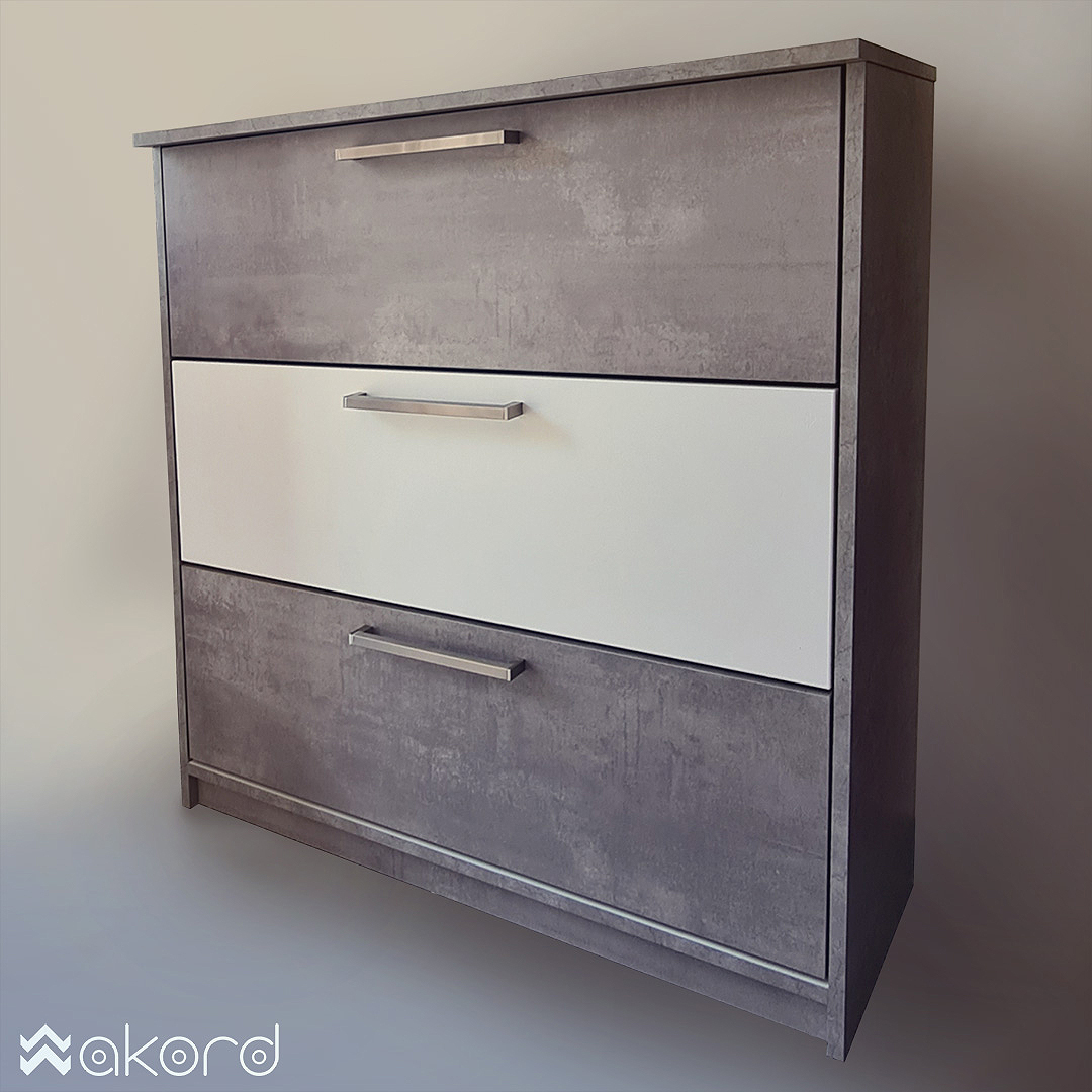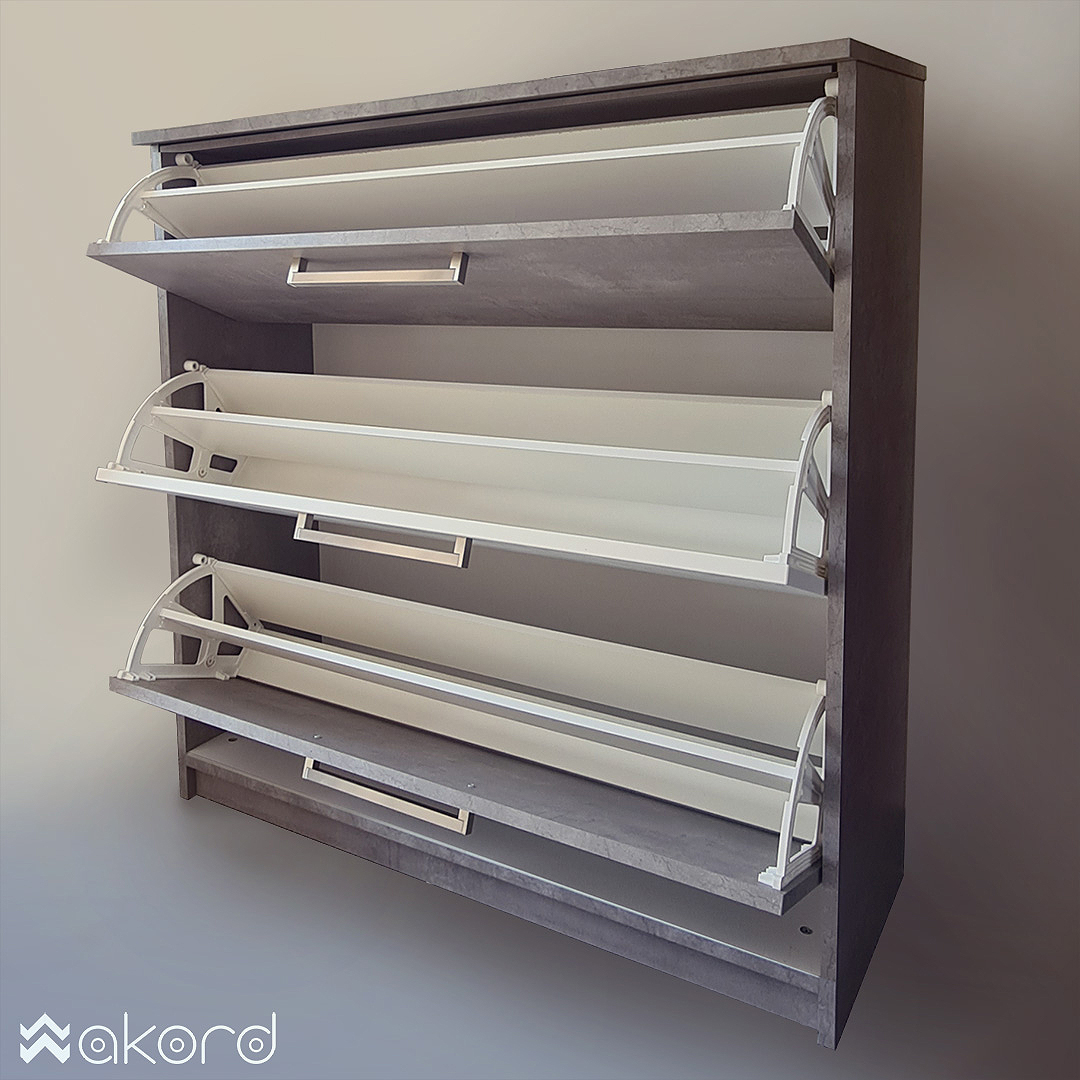 Uspravni ormari za obuću sve su popularniji zbog osiguravanja viška prostora polaganjem obuće u vertikalni ormar. Ormar za obuću izrađen je od iverala debljine 19 mm, profili su od bijelog dipejtinga i biserno sivog iverala. Pantovi s usporivačima osiguravaju lagano i nečujno zatvaranje pomoću aluminijskih ručkica.